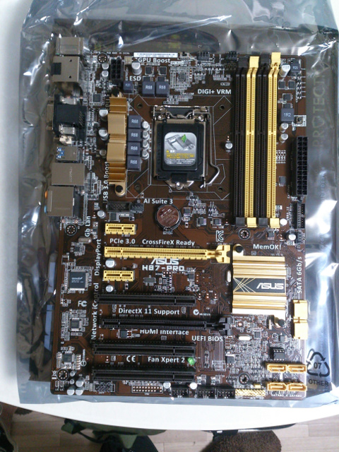- 静電気に気を付け(出来れば静電気対策用の手袋を装着)マザーボードを袋から取り出す。